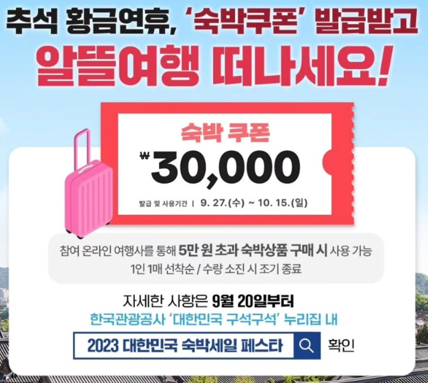 이번 추석은 '숙박대전'을 통해서 할인쿠폰을 활용하여 특별한 숙소에서 행복한 순간을 경험하세요! 정부도 10월 2일 임시공휴일 황금연휴를 국내 여행 활성화의 좋은 기회로 여겨, 30만 장의 숙박 쿠폰을 조기 배포합니다. 이번 쿠폰은 온라인 여행사를 통해 5만 원 이상의 숙박상품을 구매 시 사용 가능한 3만 원 쿠폰으로 제공됩니다. 어디에서나 사용 가능하니, 지금 예약하세요!